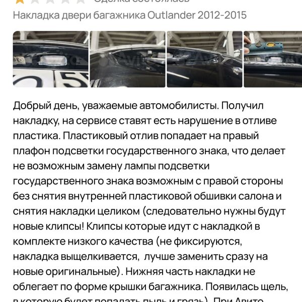 Добрый вчерени, суток. Накладка низкого качества, с правой стороны отлив попадает на правый плафон подсветки государственного номера, что значительно затрудняет замену лампы. При замене лампы предстоит снимать обивку крышки багажника целиком и демонтировать полностью накладки (предположительно перелома все клипсы). Заказывал через Авито доставку!...